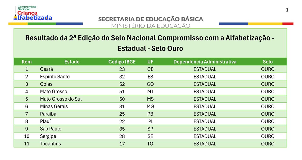 A SED (Secretaria de Estado de Educação) foi certificada com a categoria Ouro do Selo Nacional Compromisso Criança Alfabetizada 2025, concedido pelo MEC (Ministério da Educação) às redes públicas que demonstram implementação estruturada de políticas de alfabetização, monitoramento de resultados e estratégias permanentes de apoio pedagógico.